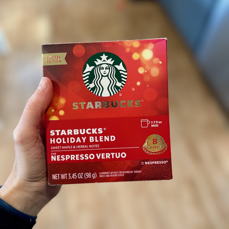 Guess what I picked up at Target when I was out with the kids? Nespresso Starbucks Holiday Blend coffee. Yum!