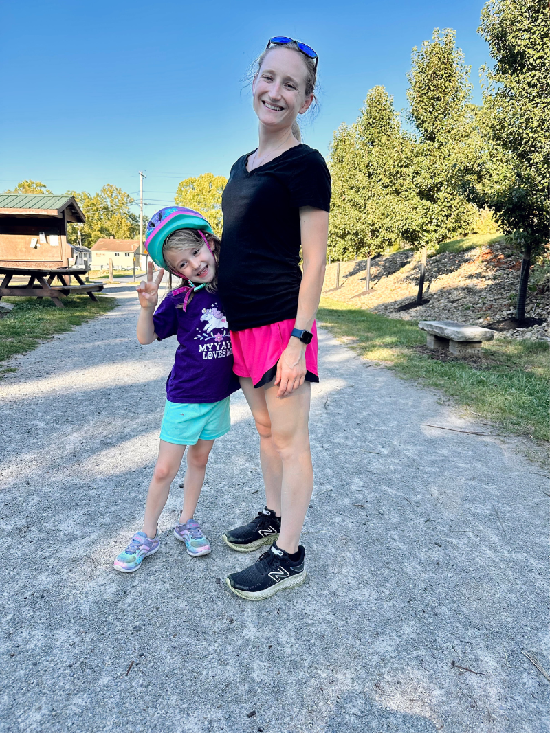 I need to start getting better about taking pictures of my bump… which is definitely there. I have transferred over to mostly maternity clothes now. Here’s one of me and Sadie on our favorite trail.