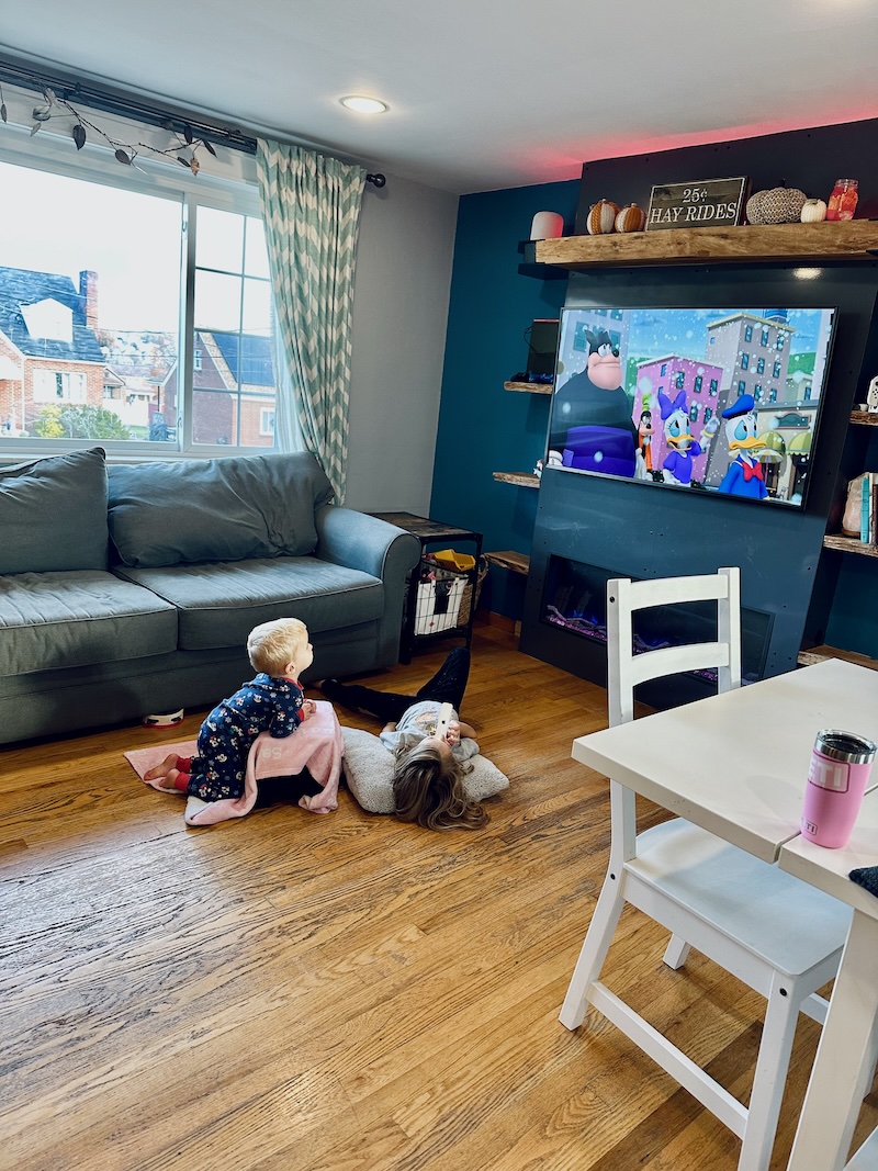 Current cuteness Sadie and Mordecai watching TV on the floor when they have two perfectly good couches near them haha.