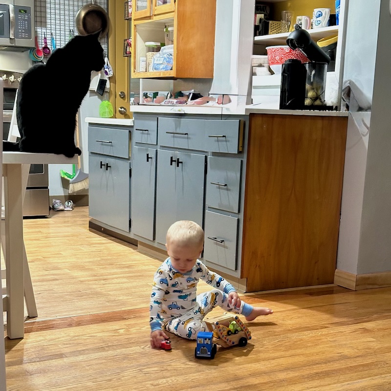 I don’t have any recent pictures of Malcolm (our cat)… but he’s as naughty as ever. His most recent antic? I was blowing bubbles for Mordecai and Malcolm was eager for me to keep going so he stood on his hind legs and dug his claws into my bump and broke the skin. He takes his bubbles very seriously!