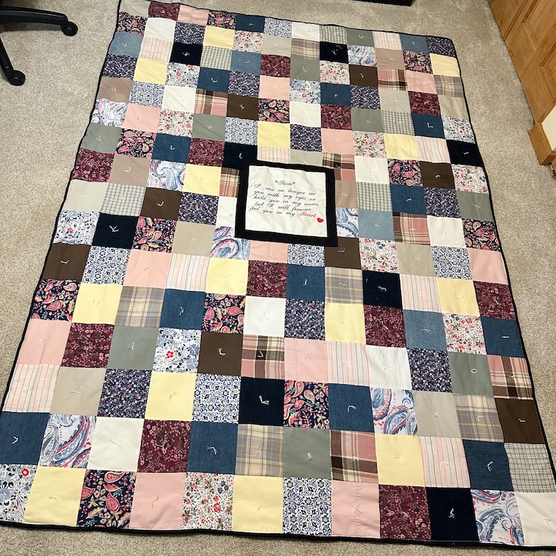 The quilt is a nice gesture, but I have to be honest, it’s not something I would want… but that’s just me. A quilt made of my sisters old clothes – she would prob feel the same way – but everyone is different!