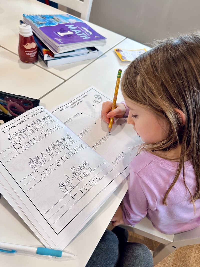 Sadie is still loving sign language, which makes me so happy! I love practicing with her. We’ve been using this workbook lately and it’s so festive ❄️