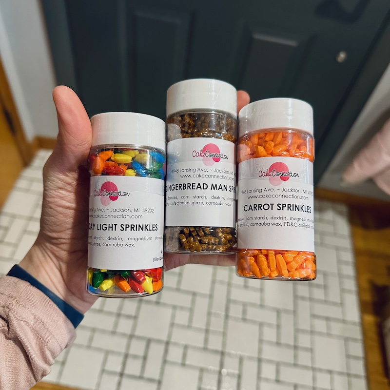 Some Christmas sprinkles I special ordered off of Etsy. Jimmy was cracking up at me this week because I called a local candy supply store and asked “Do you sell carrot sprinkles?” and they were like “What???” haha. It’s for a snowman carrot nose!