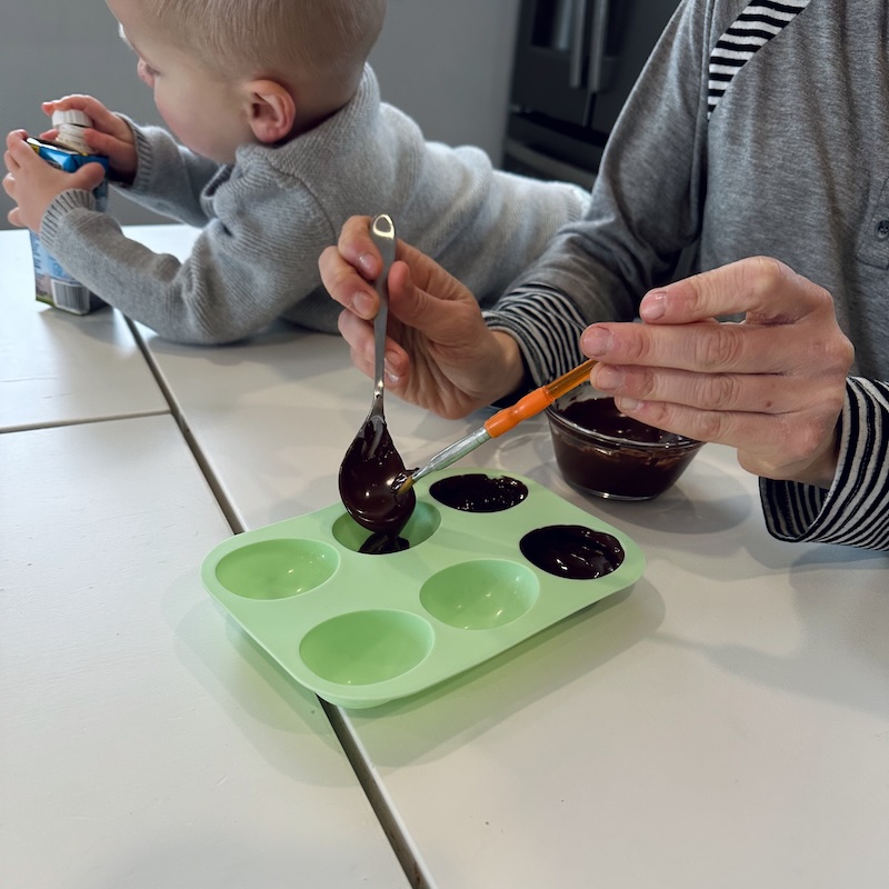 One of my–albeit silly–goals for 2025 was to learn to make hot cocoa bombs with the kids. I had an idea of how they’re made based off of making these surprise candy eggs in 2023. So, I pulled out the same silicone molds, we painted melted chocolate chips onto them and then filled them with cocoa mix and sealed them back up with melted chocolate.