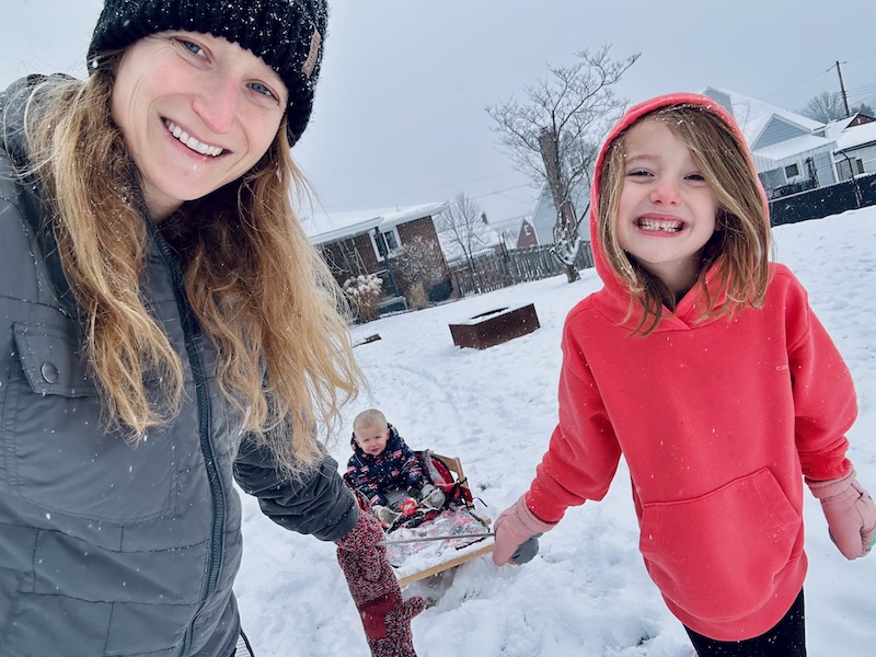 Check out Sadie’s missing tooth smile! I finally decided to just borrow Jimmy’s winter coat because my bump is not very comfortable under mine anymore, haha. Also, I am very thankful Sadie helped me pull Mordecai in the sled!