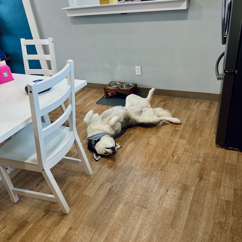 Siberian husky laying on back in kitchen