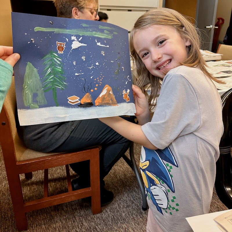 On Saturday, Sadie and I went to a painting class at the library. There was a story about snow and then we got to paint our own snowy scene. Sadie made a painting, I made one, and then we created one together.