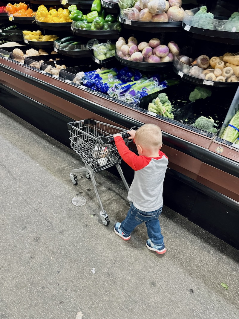 The kids still think our local grocery store with mini carts is just to coolest place ever. I’ll take it, haha. Is it slightly nerve-wracking thinking they will accidentally bump into someone or a display? Yes, but it’s a great learning experience for them to be aware of their surroundings and help mom shop!