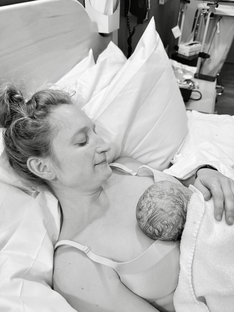 As she broke my bag of water, she said “I see baby’s first curl!” and I was having a contraction and said “WOOO” in a slightly terrifying growl-voice hahah. Her head came out, and then I felt her shoulders come out and then relief! She was out in the world! It was 3:33 pm.