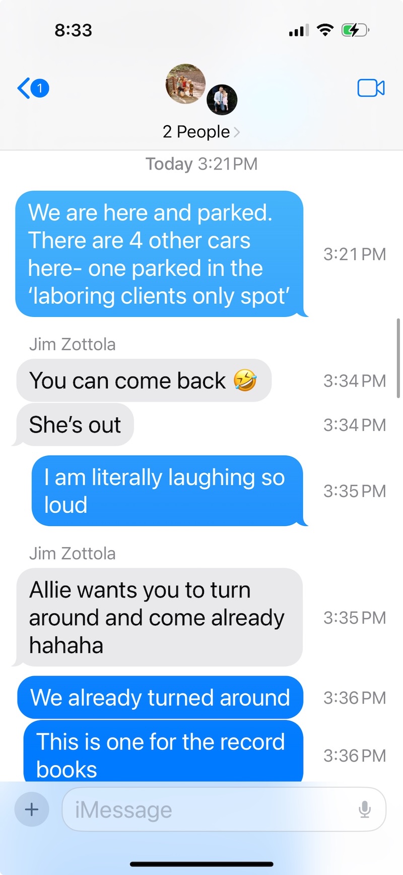 My dad ran up to the door and rang the doorbell no less than 20 times and once the intercom buzzed he said “My daughter is Allie Zottola and she’s going to have a baby in the parking lot if you don’t open the door!”