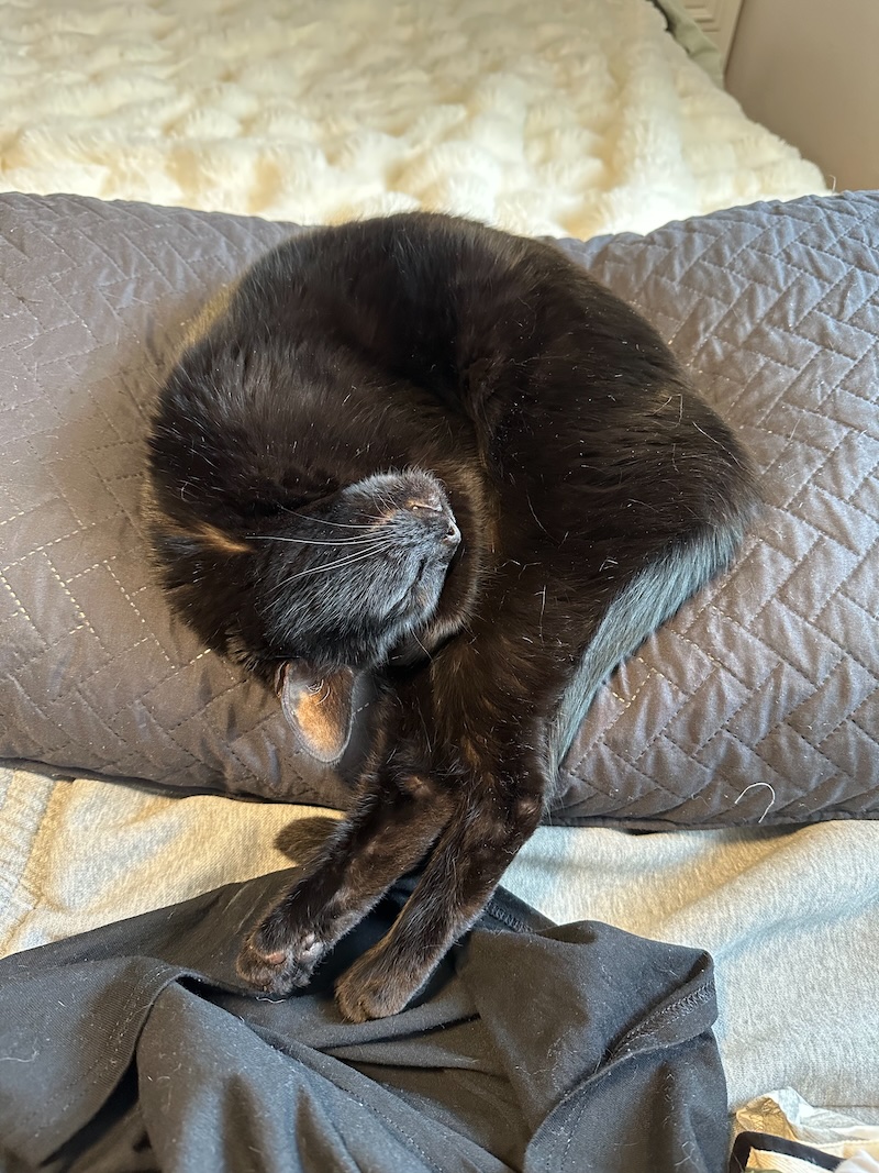Malcolm likes to lay on anyone napping. And he likes to lay in some crunched up positions. I found him laying like this (below) and checked to see if he was breathing because I thought there’s no way an animal can naturally lay like that?!