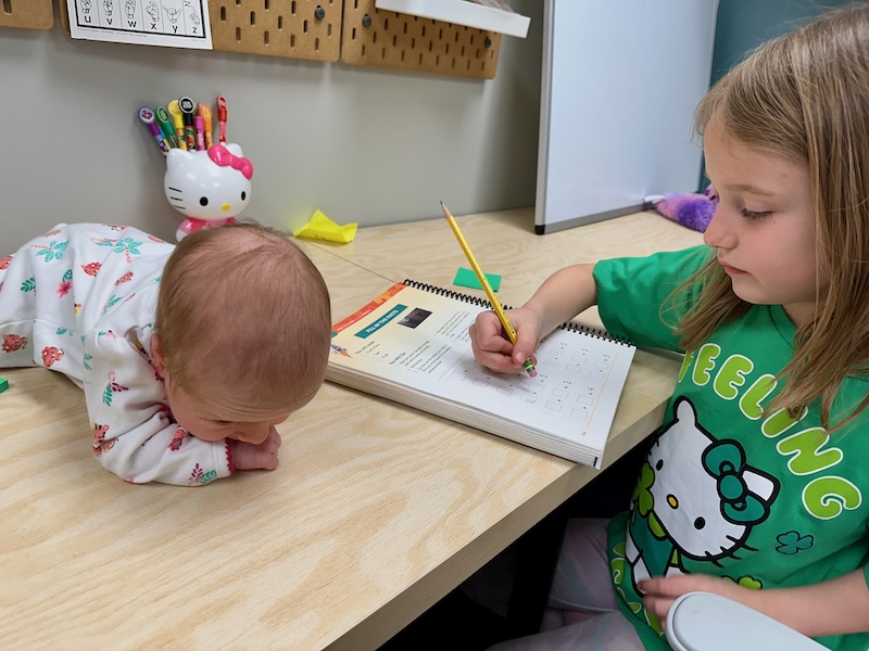 It’s neat how things look so different than they did just a few weeks ago. Now we have Dakota doing tummy time while she watches Sadie do math and Mordecai helps Jimmy run the shop’s crane. I love it so much.