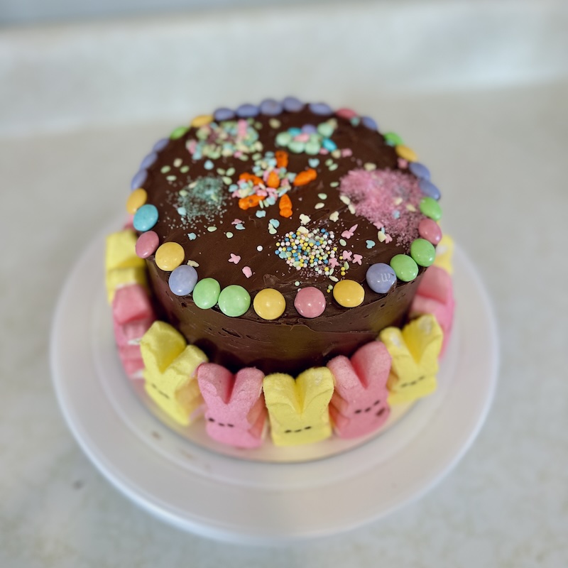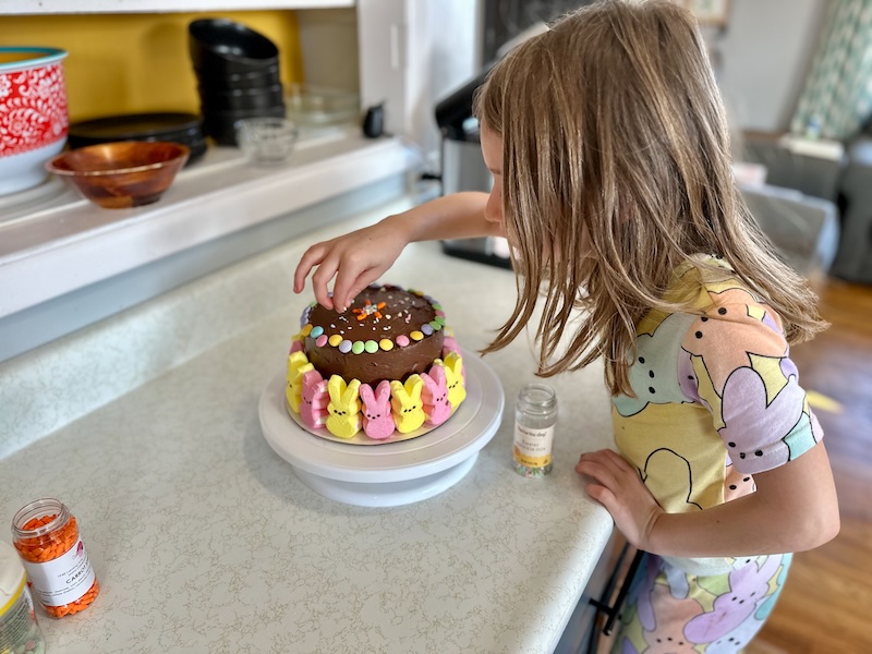 I tried to be as hands-off as possible and let her do most of the work by herself–cracking eggs, measuring, mixing, and decorating. We made the cake chocolate with chocolate frosting… and of course lots of Peeps and spring-themed sprinkles!