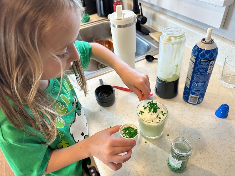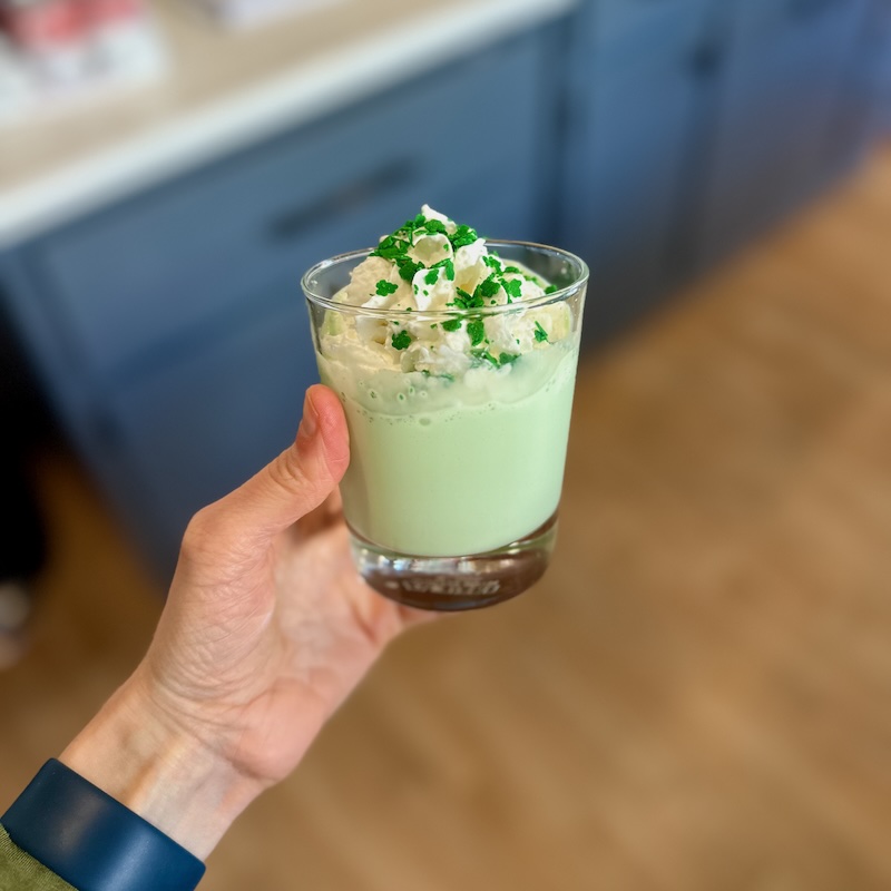 We had some from McDonald’s recently and wanted to see if a homemade version would taste better. So we used vanilla ice cream, whole milk, peppermint extract, whipped cream, and clover sprinkles to make them. The verdict? Homemade is better!