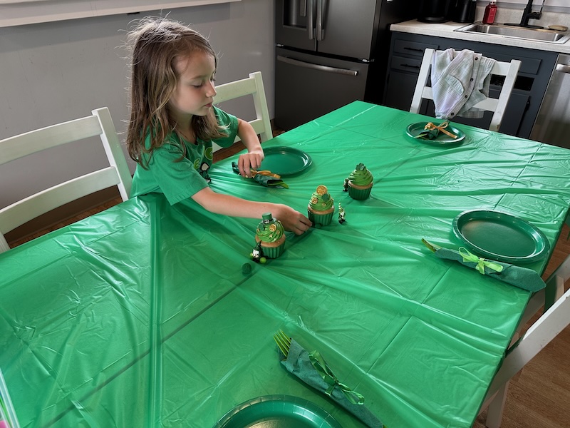 We read St. Patrick’s Day books, and did our usual daily routine of school and such. Once Mordecai and Dakota were napping in the afternoon, Sadie and I got to work on decorating our kitchen table and did some baking!