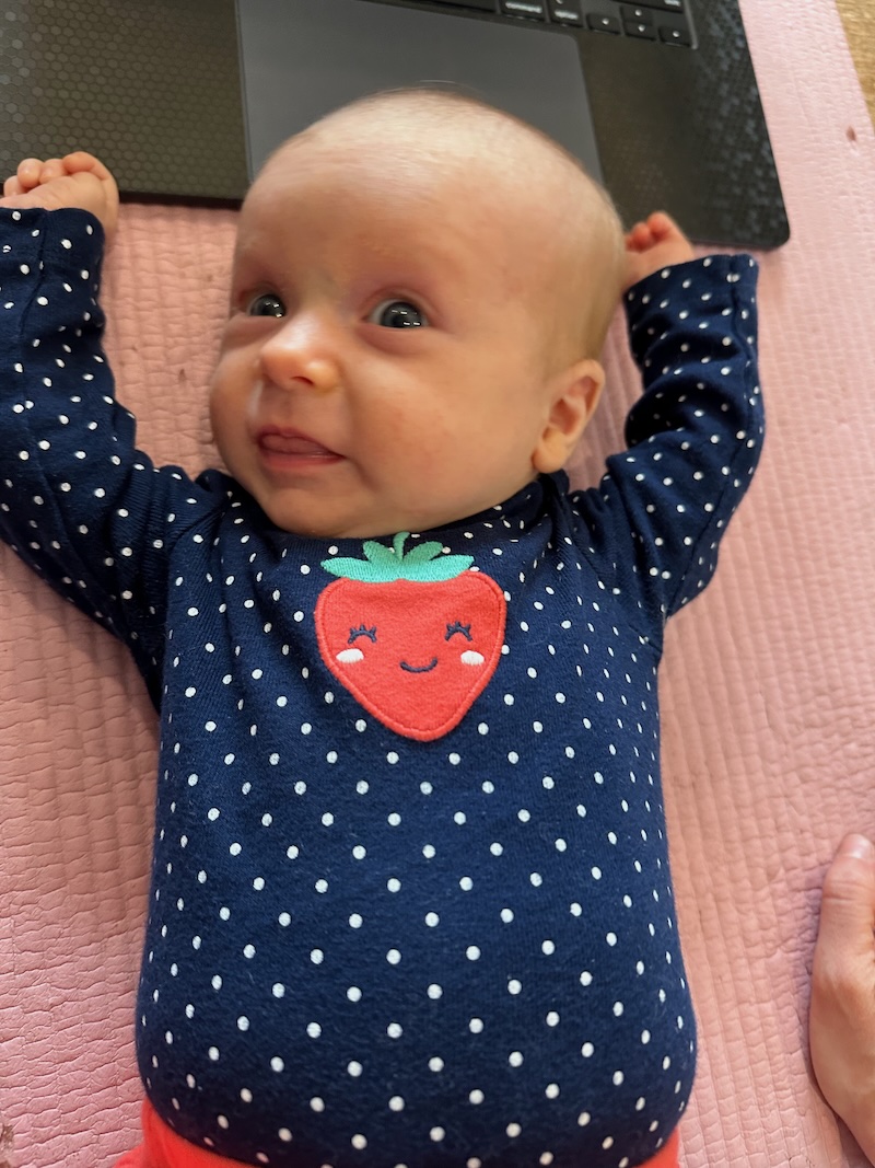 Strawberry stretch! Dakota is rockin’ Sadie’s old onesie in the above picture and I love it 🍓