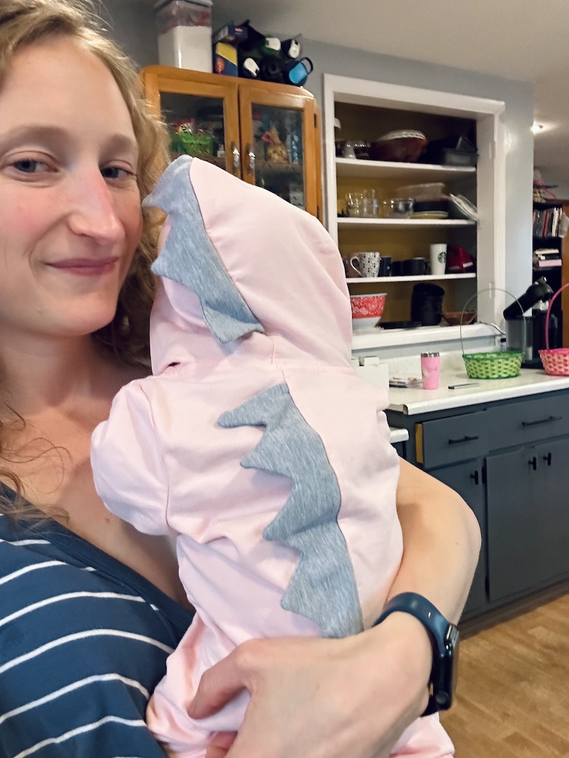 Dakota in Sadie’s dinosaur onesie is so cute!