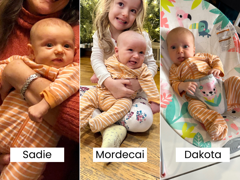 Want to see one of my favorite things? The kids all wearing the same sleeper as babies! This orange sleeper was given to me as a hand-me-down from a friend who had two kids before I had Sadie, so these pajamas have been worn by five babies.