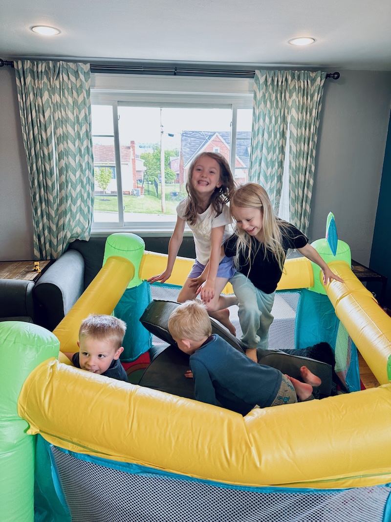 It was a little chilly in the morning so the kids pulled out our bounce house and it came in clutch! They put every pillow, couch cushion, and stuffed animal into that thing. That has still proven to be the best $100 I spent lately 😜