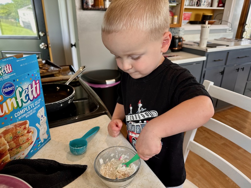I took a quick shower and then Mordecai requested pancakes for dinner. We made Funfetti pancakes together (along with sausage!). He was so happy to mix and pour!