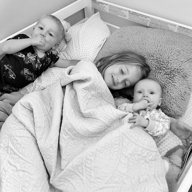 Current cuteness The kids all woke up at the same time and snuggled in Sadie’s bed. The sweetest 🤍