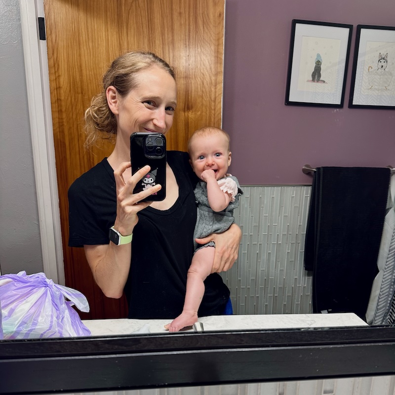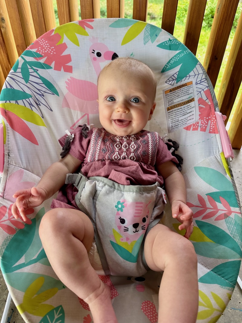 Also, she has been trying to crawl lately?!?! I’ll lay her on her back on our bed, she’ll instantly roll over, and then bring her knee up toward her chest to scoot herself forward. It’s too soon for that, Dakota! SEND HELP 😂