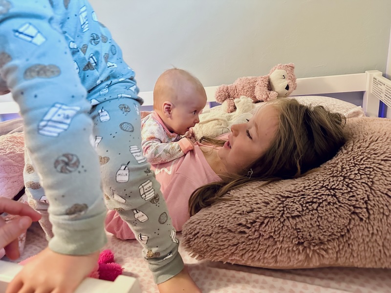 The kids kept waking up at the same time (well… waking each other up because one would wake up and call for me and then the others would hear them and wake up 😂 #smallhouselife) and then snuggling in Sadie’s bed. I love those moments 🫶