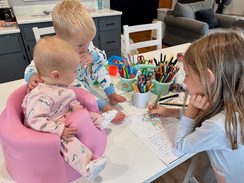 Sadie and I were working on some schoolwork Mordecai and Dakota were very interested! Homeschooling with little ones around is hard and good. There are a lot of interruptions but they also pick up on so much of what Sadie is learning!