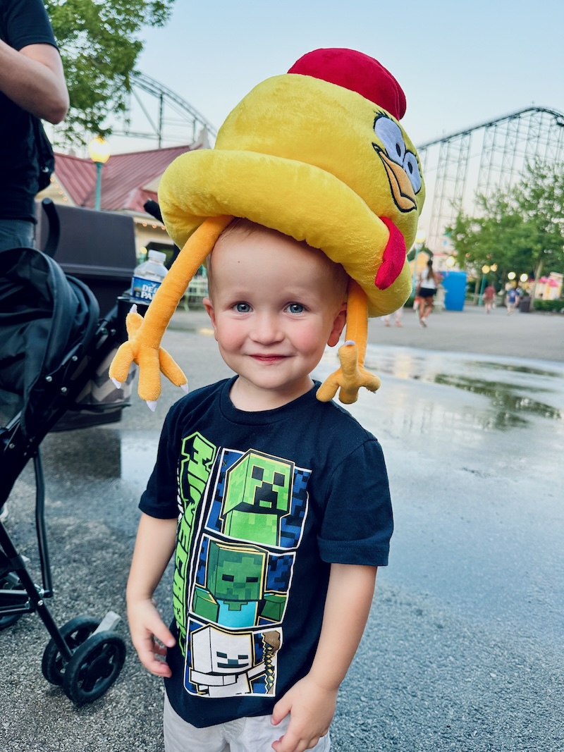 Dakota was unimpressed by the merry-go-round but loved the chicken hat?!
