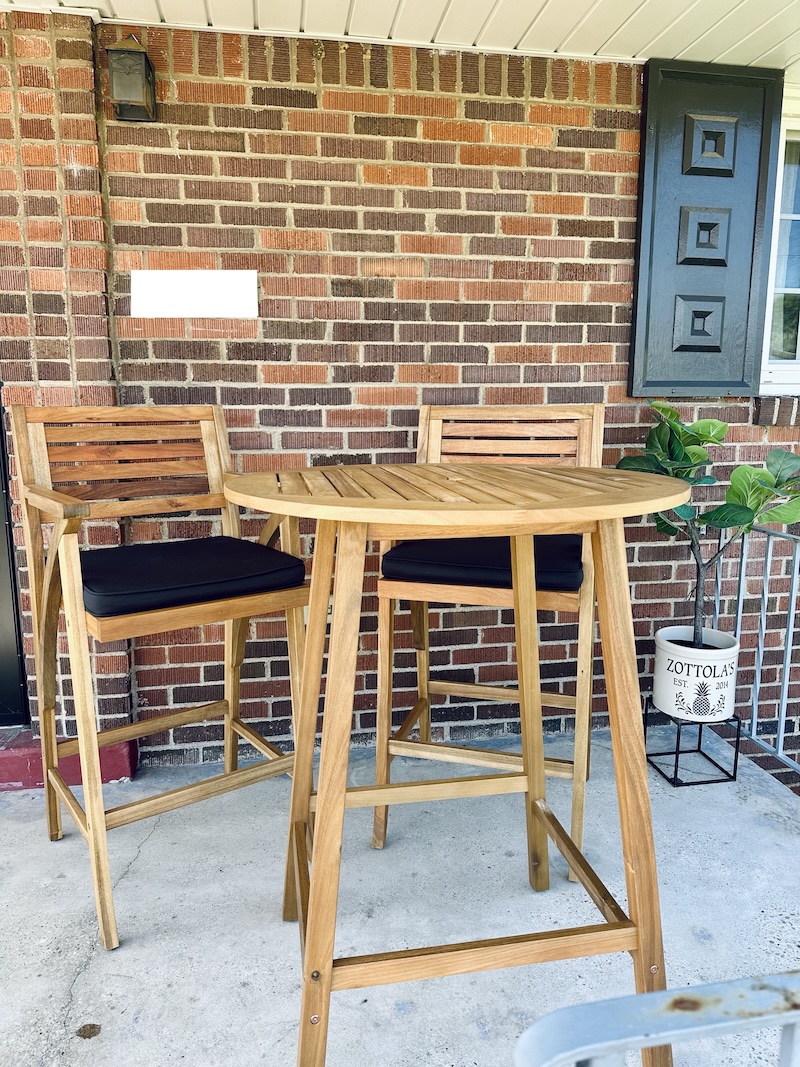 I decided on a bar-height table and chairs made from acacia wood. We bought them on Amazon (risky, I know!) and I have been very impressed with the quality! I went to Hobby Lobby and picked up some detail pieces like a braided rug, fiddle leaf fig tree, banana leaf plater, and fern wreath.