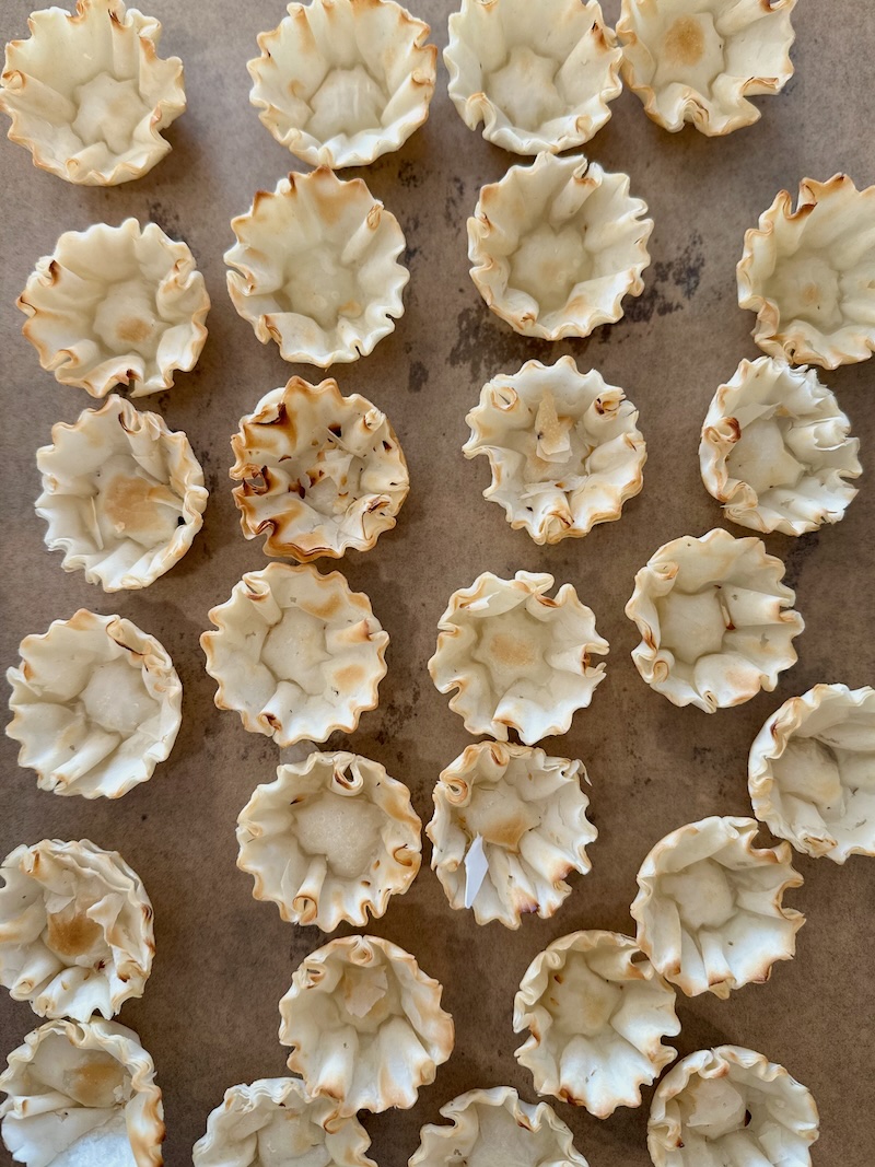 1. Bake phyllo shells according to package instructions and cool. I used this brand and baked them on a parchment-lined cookie sheet for five minutes at 350 degrees.