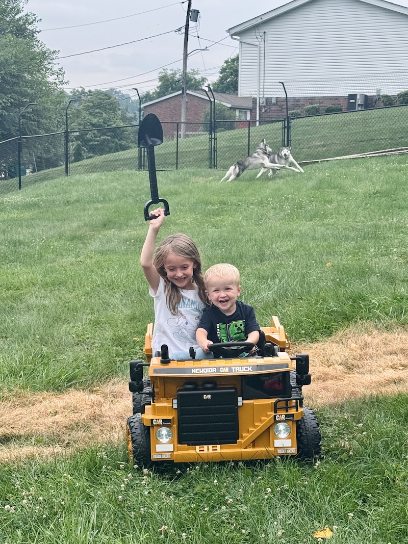How cute are Sadie and Mordecai riding in Mordecai’s dump truck?! They spend hours together in that thing and it’s so cute. It has a shovel attached to the side and it actually dumps dirt. They do some major “work” around the yard 😂