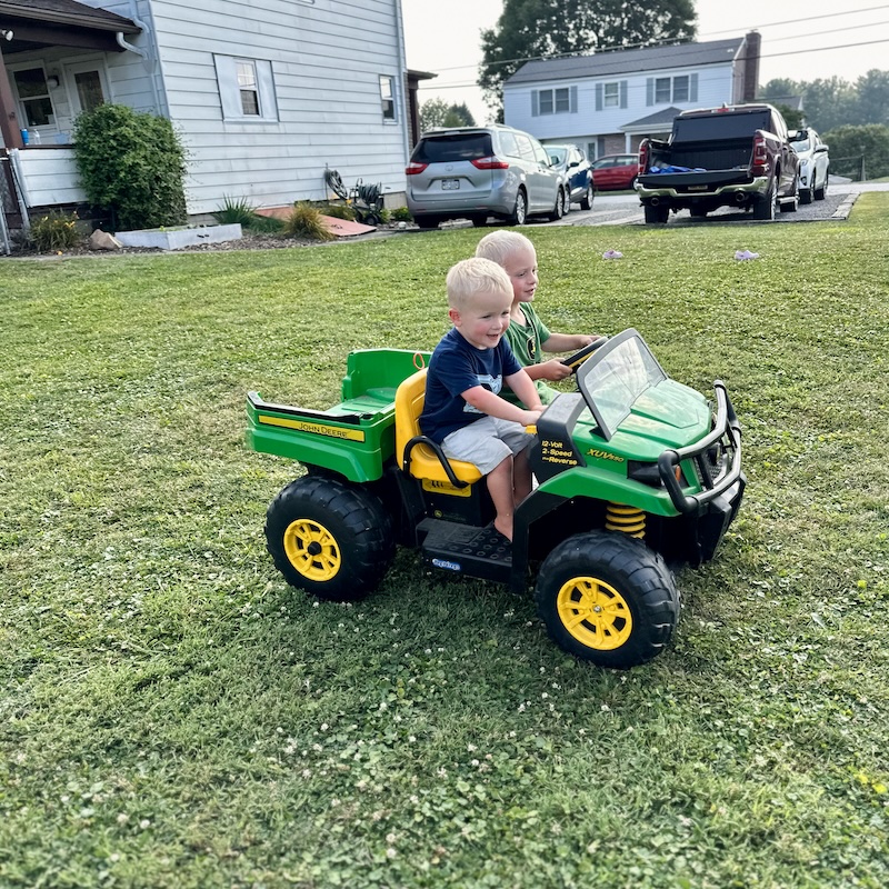 Titus’ party was John Deere-themed and the kids enjoyed riding the little John Deere tractor! I feel like before we know it, Titus and Mordecai will be jetting off in a real car together 🥹