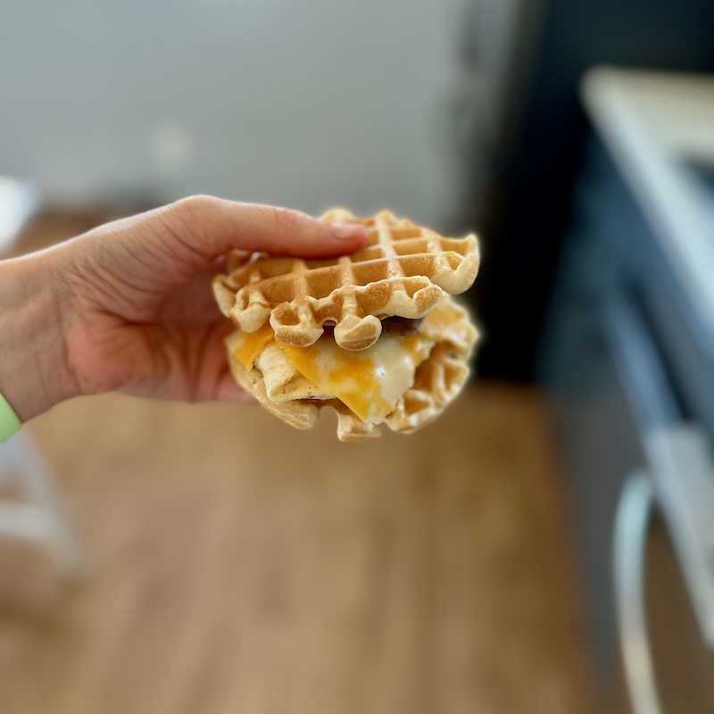 In other news, I got this idea idea to use my mini waffle maker to make a waffle breakfast sandwich! Two mini waffles were the “bread” of the sandwich and inside went bacon, a fried egg, and cheese. That was fun!