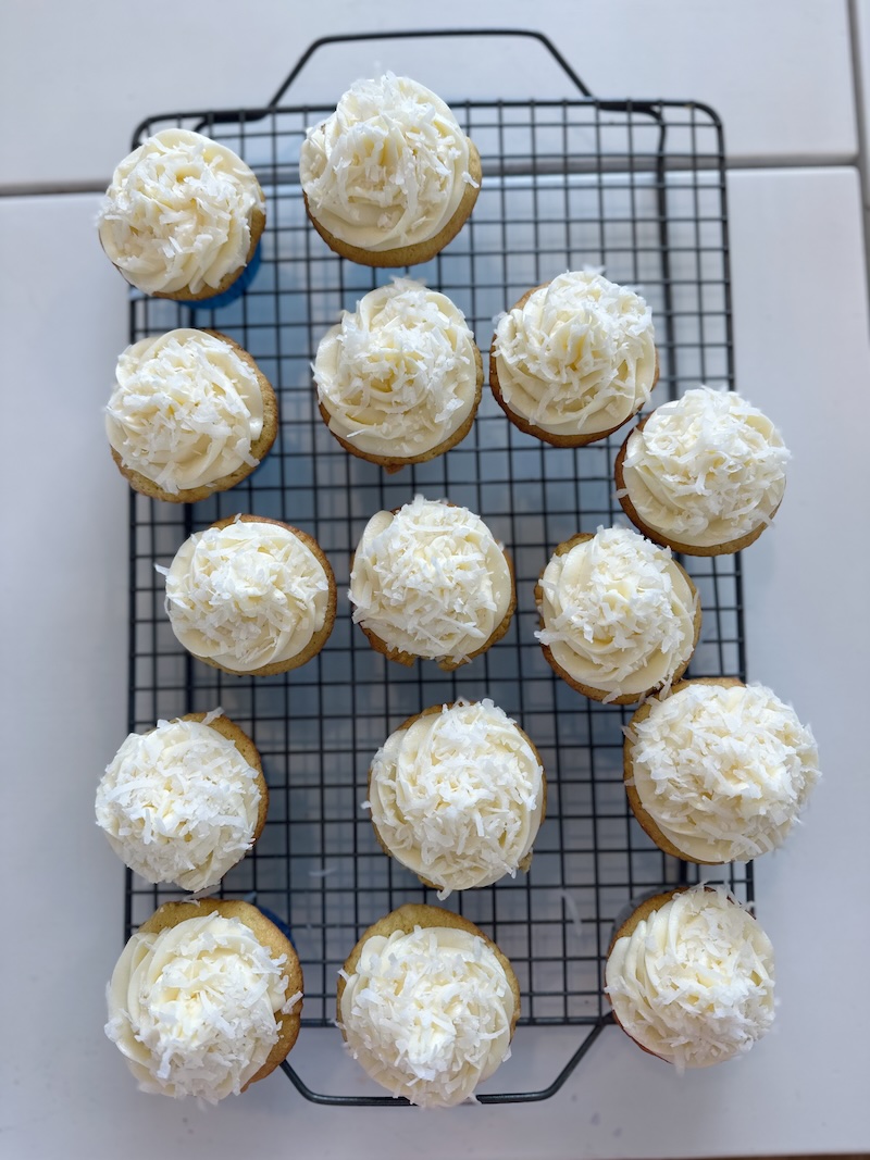 I made my mom some coconut cupcakes to cheer her up! Sadly, my mom and dad’s dog, Reggie, recently died and she was feeling bummed (rightfully so!). We both read Ina Garten’s memoir and were enamored with her coconut cupcake recipe. So I made them!