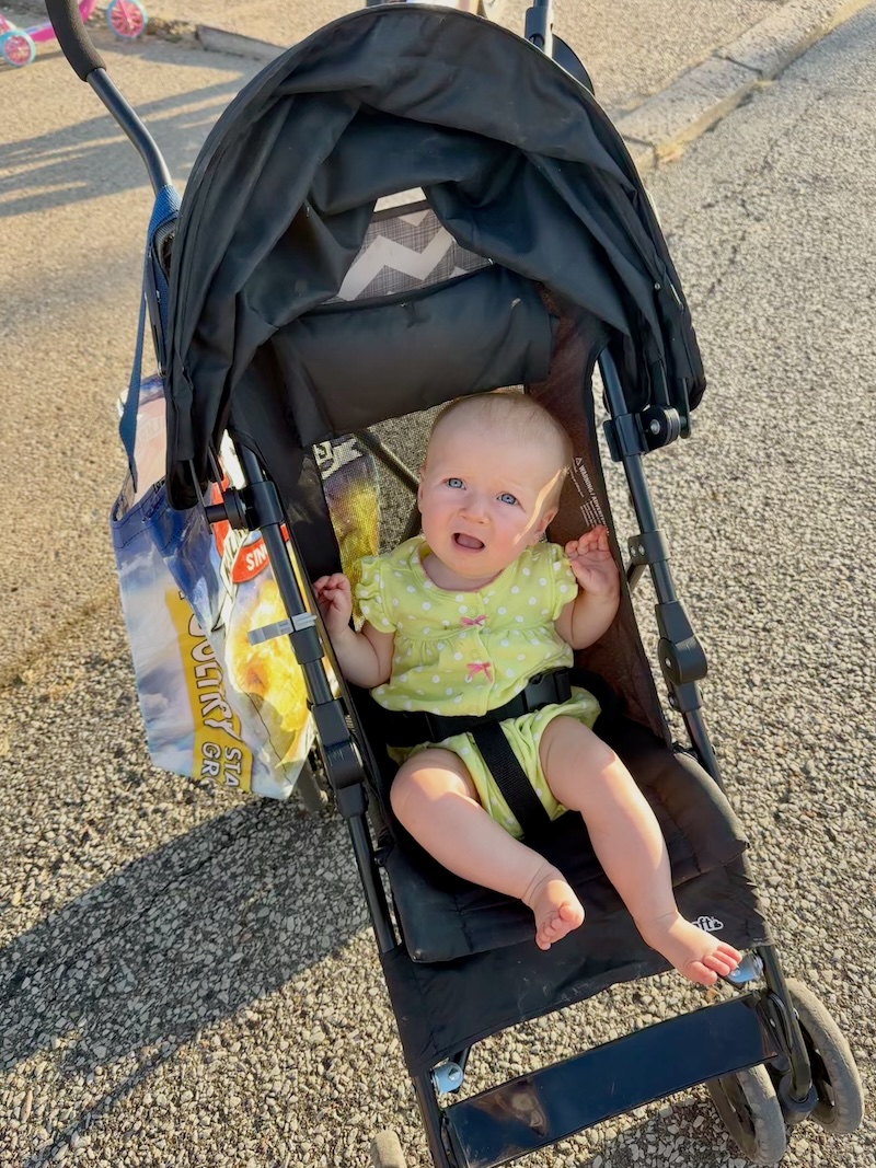 Recently, Dakota fussed every time we put her in her stroller that connected to her carseat. We finally figured out she was ready to be upright in an umbrella stroller. We made it through a walk around the block with no crying!