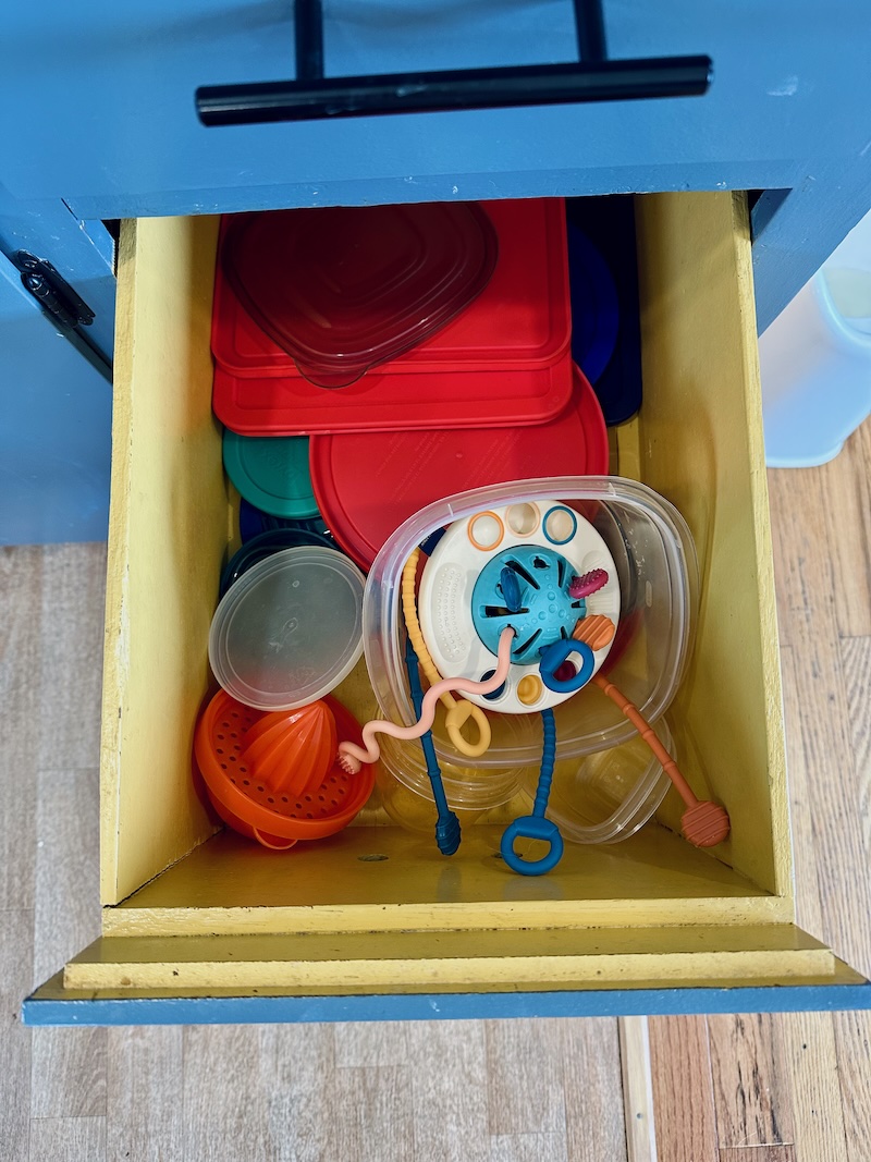 I was putting away dishes and opened our Tupperware drawer and saw Mordecai put Dakota’s toy in there. That kid!! Just the other day, he found our change bowl (we put loose coins in a bowl by the front door) and put them allll in Jimmy’s work jeans pocket and they fell out at 5:00 am when he was getting dressed! Oh, and the missing remote? It was in Mordecai’s play sink. He’s reminding me of toddler Sadie putting veggie straws in vases.