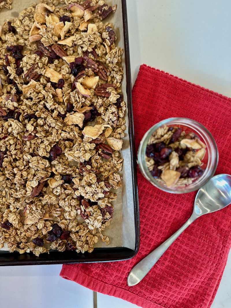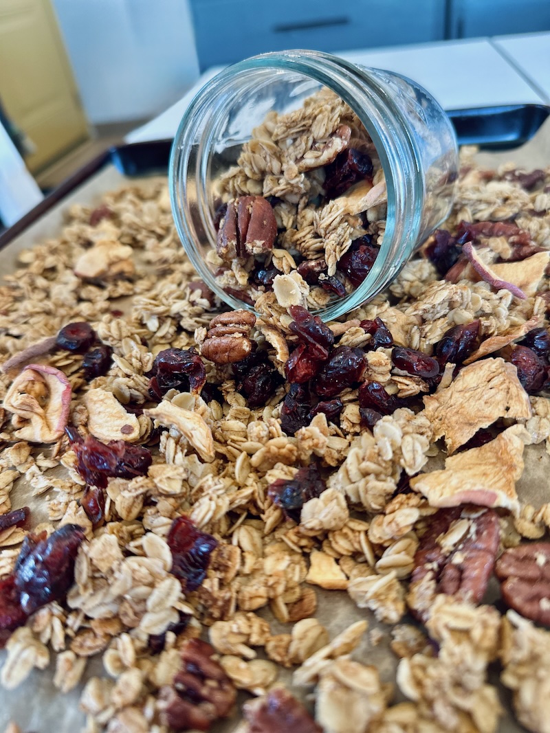 This granola is naturally sweetened with maple syrup and made with wholesome oats, pecans, dried cranberries, and unsweetened apple chips. It’s a healthier option compared to store-bought granola with refined sugar or additives. It’s satisfying and delicious.