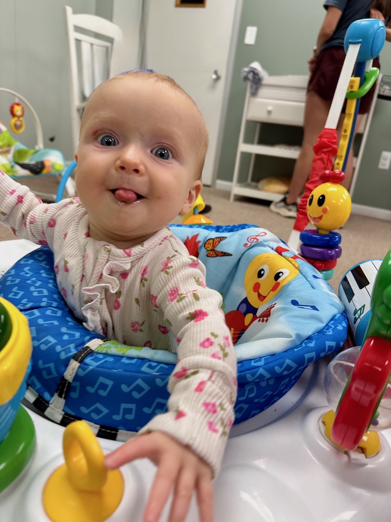 New skills Sticking her tongue out 24/7, holding toys, starting to sit up unsupported and standing while holding our hands or in a bouncer, and trying to crawl.