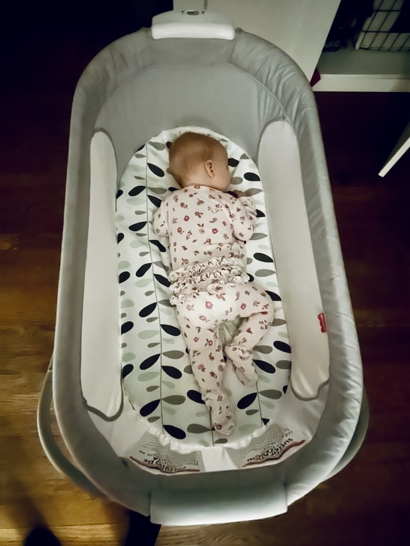 Sleeping Not great, LOL. She goes to bed around 8:00 pm and is up quite a few times in the night to eat or just roll around in bed. In the day, she takes 2-3 naps. We finally weaned her off of the Merlin sleepsuit (loved that thing!), so she just sleeps on her own or with a blanket.