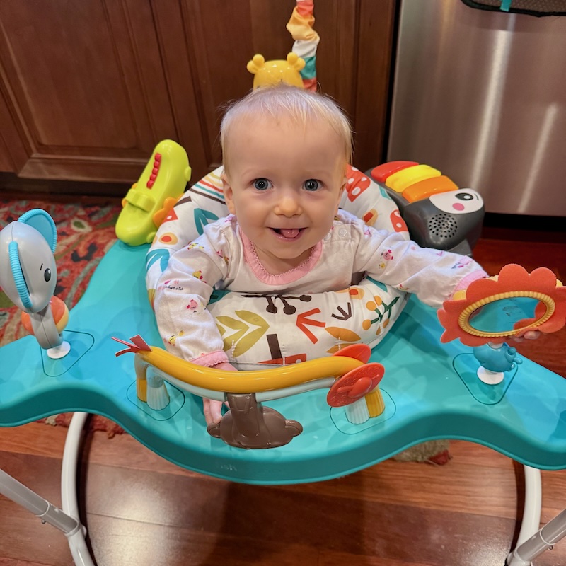 Favorite Products Diaper pail, teething toy, Lollipop baby monitor, Bumbo floor seat, Sing & Snuggle Violet, Bamba peanut butter suns, Rice Rusks, crib, car seat mirror, wash cloths, and silicone spoons.