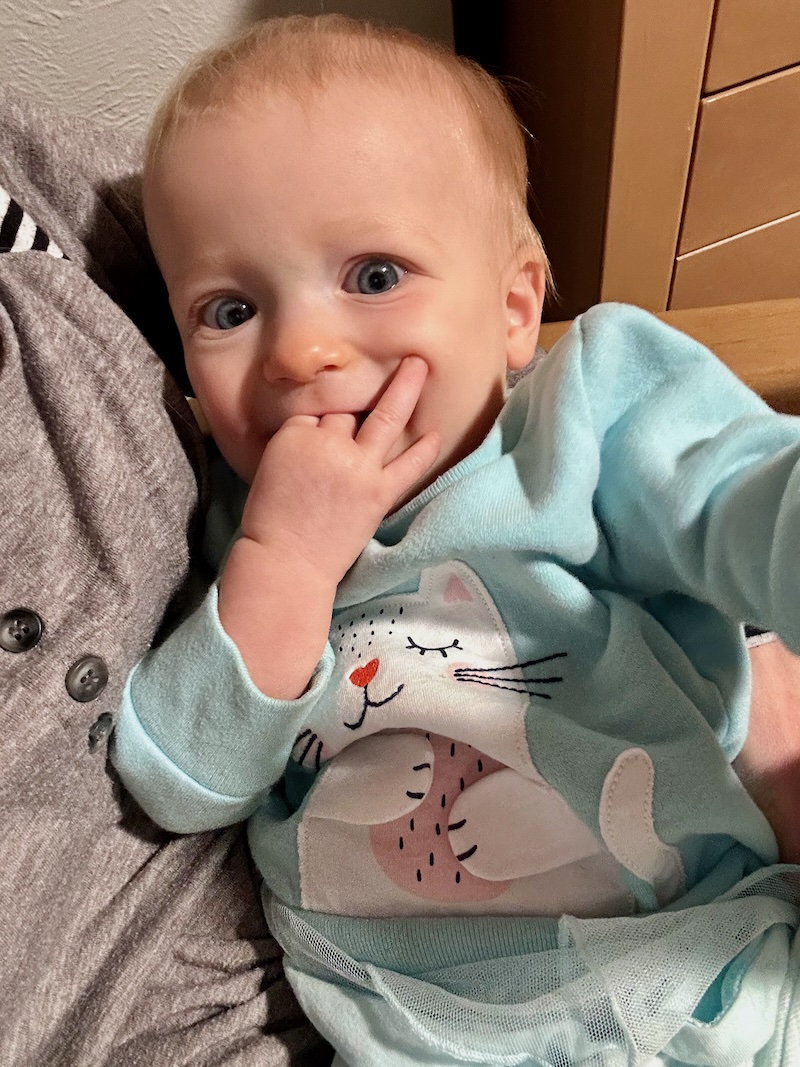 Likes Her siblings, being outside, moving, bath time, eating, music, toys, books, our pets, sucking her fingers, trying to drink from her sippy cup, and being held.
