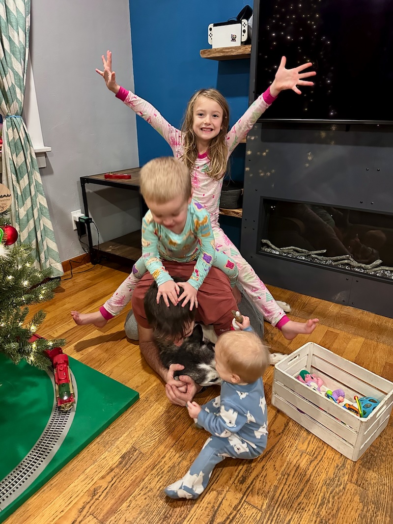 The kids stacked themselves on top of Jimmy. Can you spot Niva?