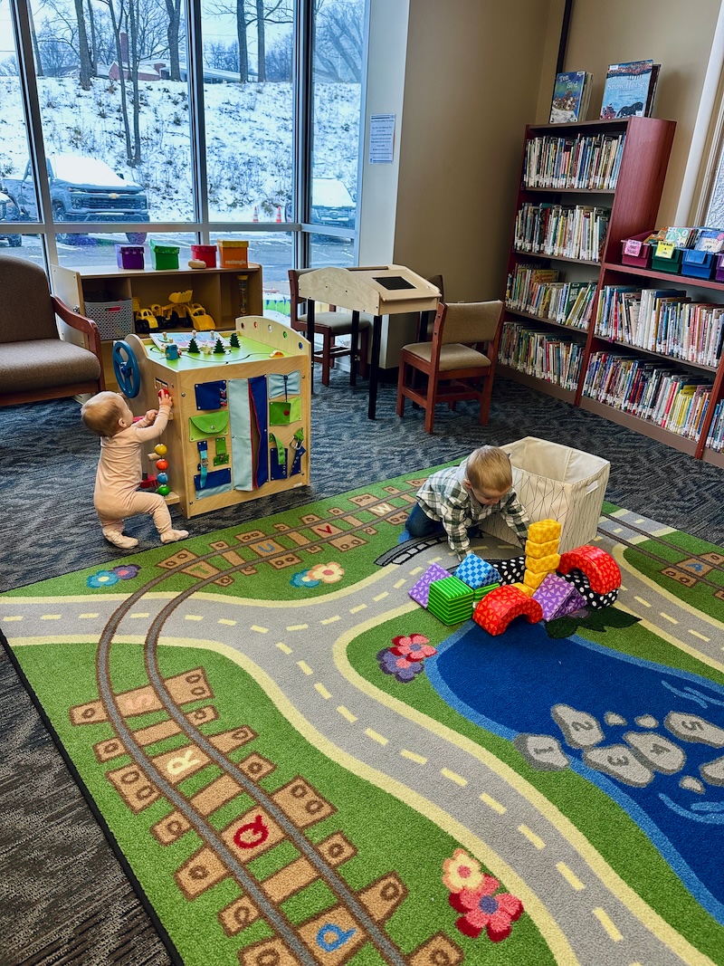 We went to our local library so the big kids could attend “crafter noon,” which was an afternoon arts and crafts time. Mordecai lost interest after he made a bookmark, so I brought him and Dakota to the play area while Sadie continued to make New Year’s confetti crackers.