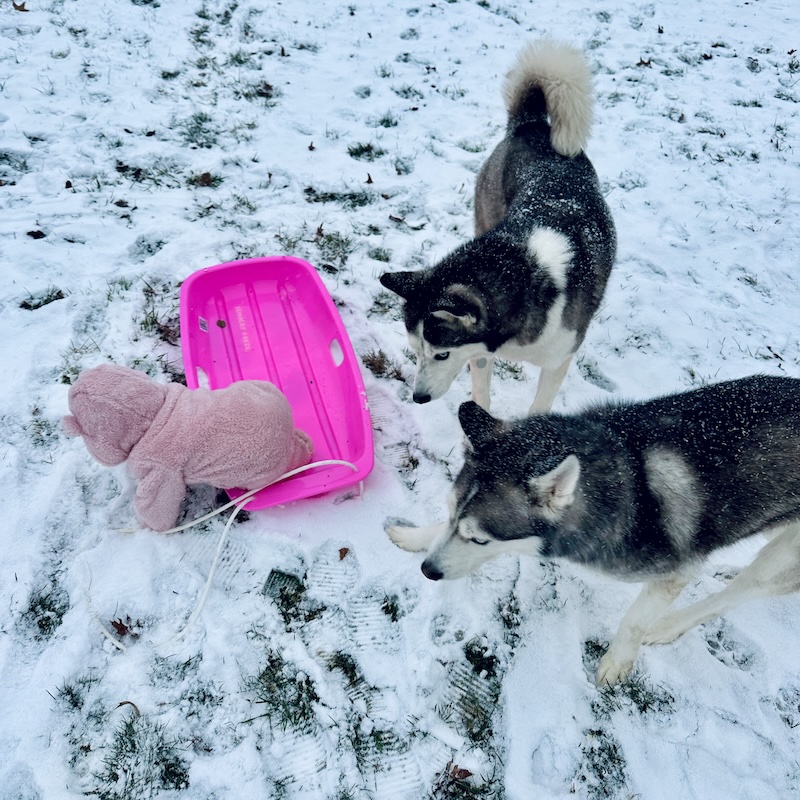 In the evening, we all went outside in the snow! We’re pet sitting Niva’s best friend, so it was extra fun having two huskies to play in the snow with us.