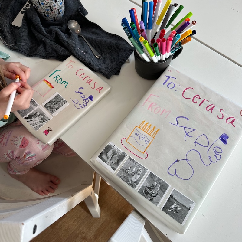 We hung out around the house and did some cleaning. Sadie worked on wrapping and decorating presents for her friend’s birthday, too. We still love using my sticker maker to print pictures as stickers to decorate gifts and cards.