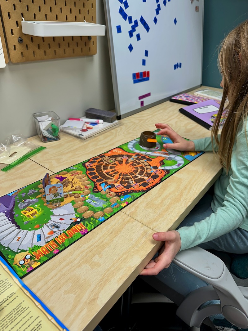 We keep a lot of our educational board games at the homeschool room, so we took the opportunity to pull out Math Island and played.