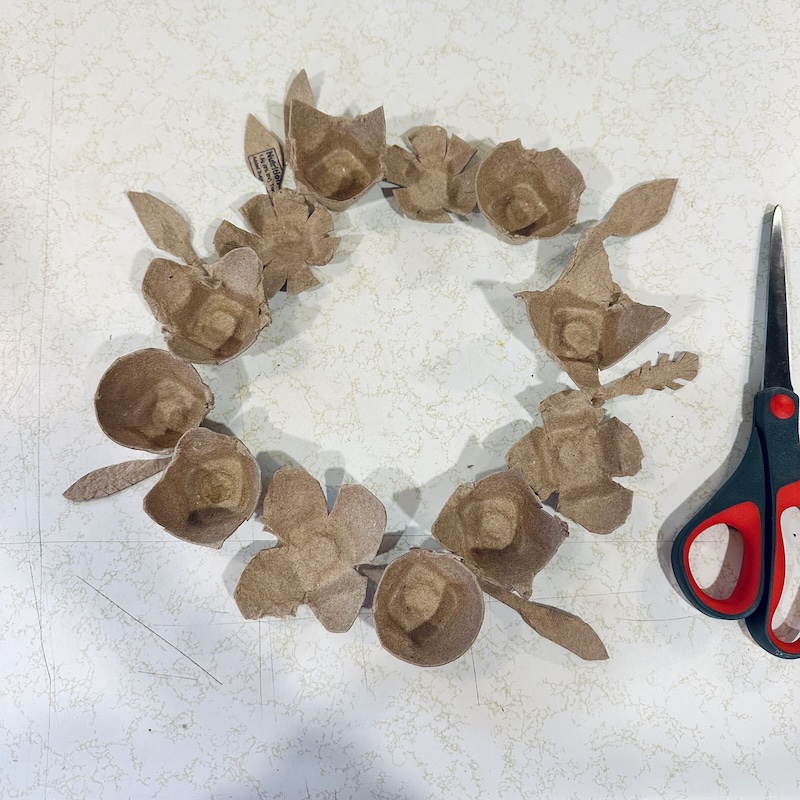 I started cutting the carton into flower and leaf shapes and forming it into a wreath.