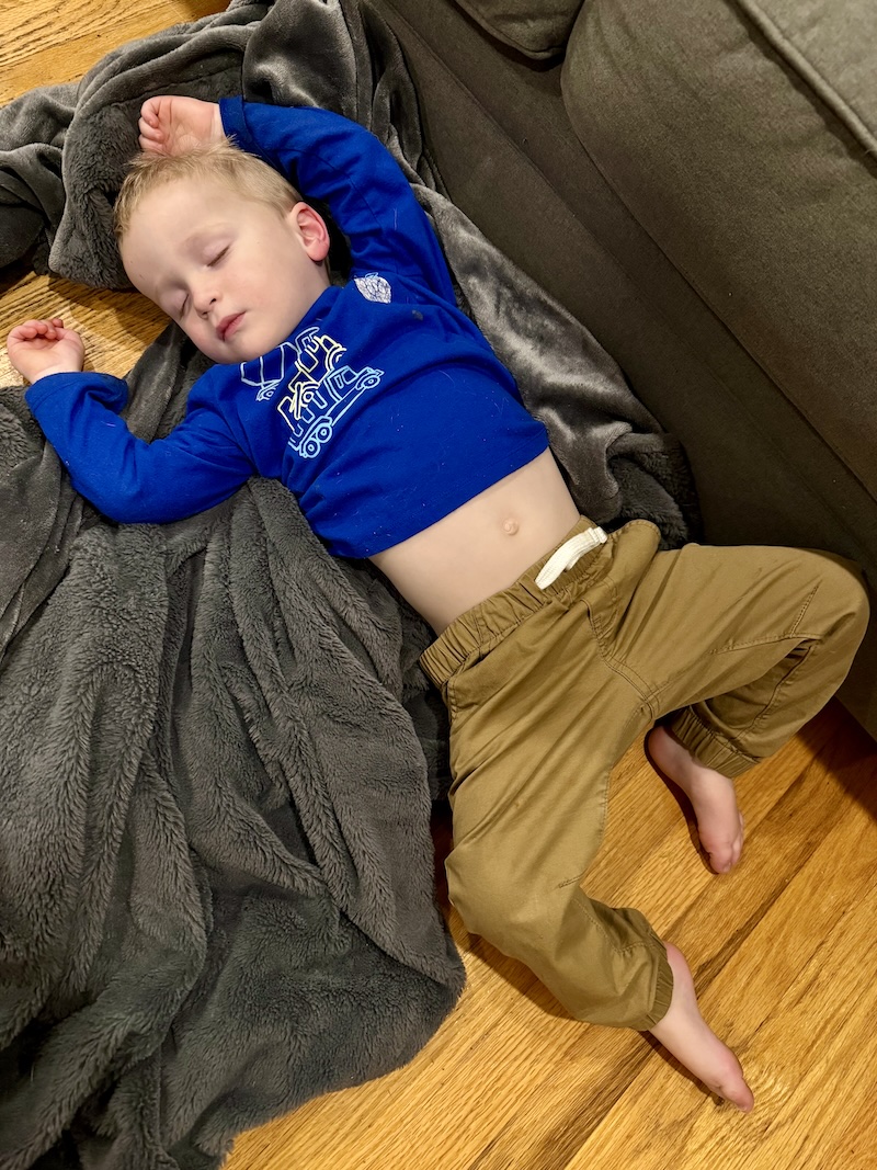 All the excitement must have worn Mordecai out because he crashed that evening—right on the living room floor!
