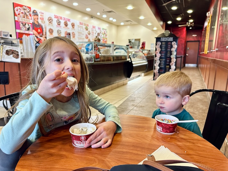 I learned my lesson from Coldstone the night before and bought Dakota her own ice cream cup. When I had brought the kids to Coldstone, Dakota was screaming because she wanted Sadie and Mordecai’s ice cream! No screaming happened this time, except when I couldn’t shovel the ice cream in her mouth fast enough. 😂